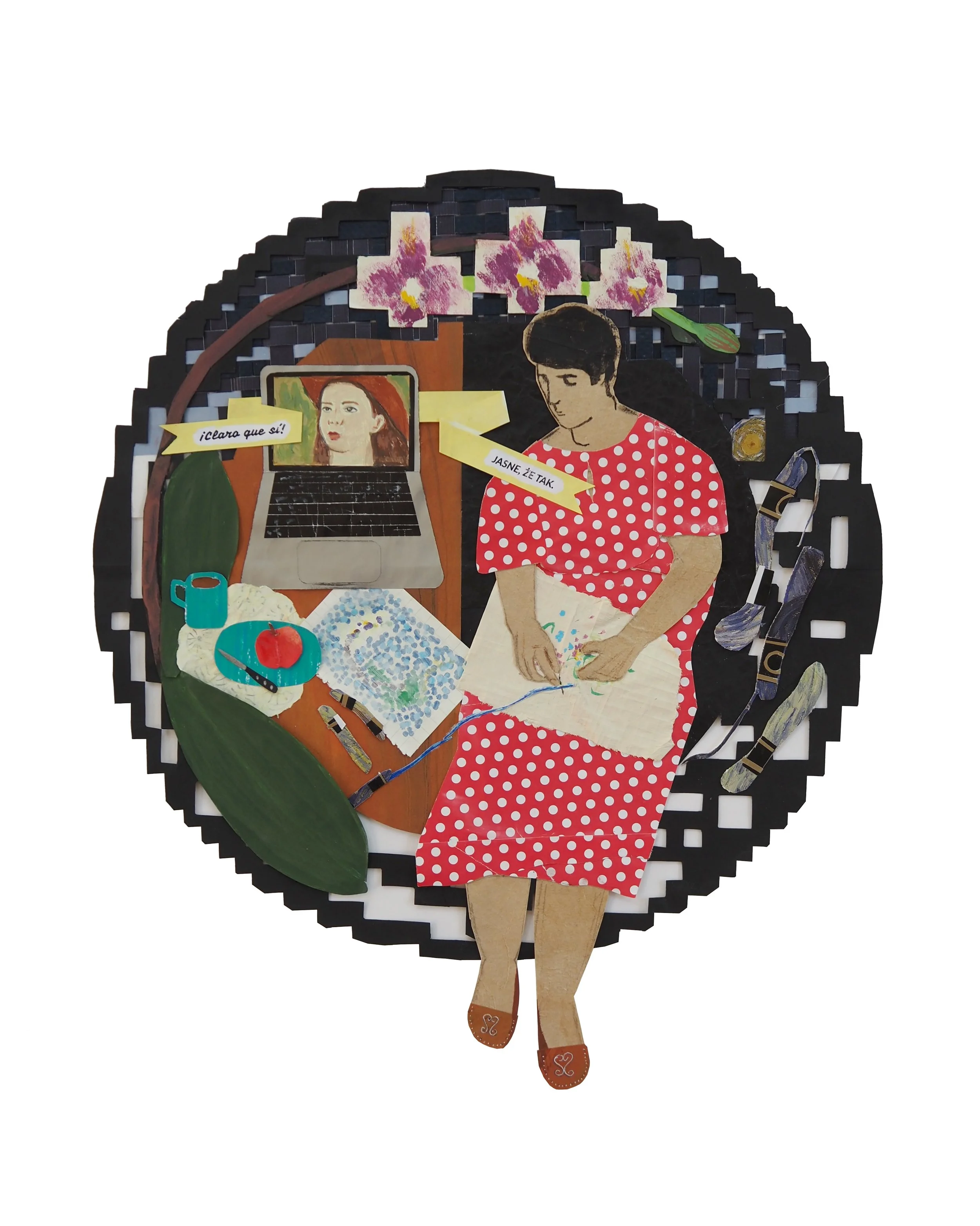 A series of collages remembers a typical weekday in the life of my late mom. Scenes of morning errands on Myrtle Avenue in Queens, NY, afternoon meal preparations, and evening crafts on the living room couch allude to the way she combined household work and respite as a Polish-American homemaker: groceries and flowers, meal prep and dessert coffee, and finally, handiwork and dubbed soap operas. My collage principles are inspired by visual motifs found in traditional folk art paper cuts, specifically from the Łowicz region of Poland.